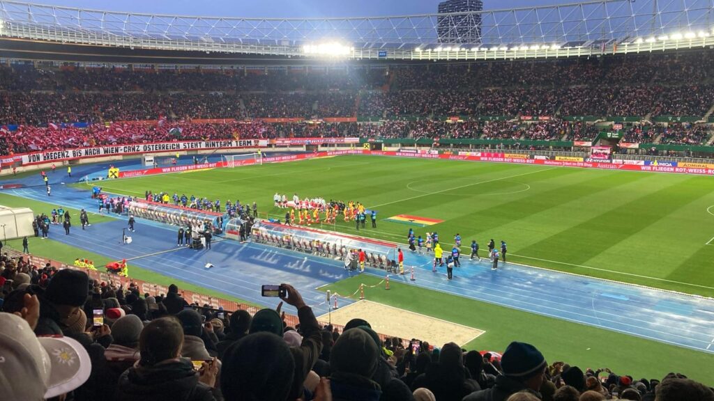 Jubelstimmung im Happelstadion schon bei den Hymnen. Schade, dass man wegen der Laufbahnen sehr weit weg vom Geschehen auf dem Rasen ist. Dennoch: “Immer wieder, immer wieder Österreich!”