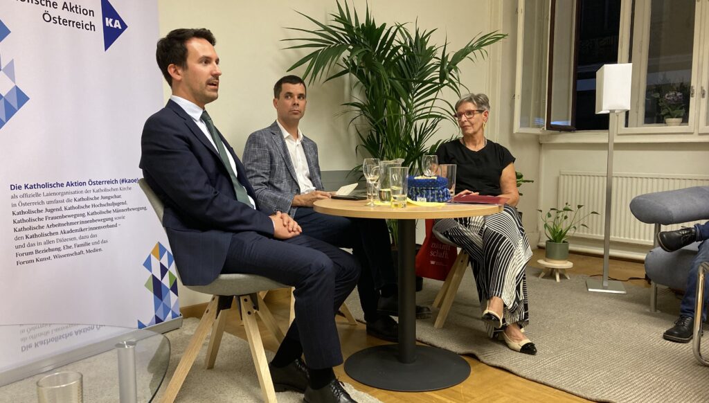 Fortsetzung der hochkarätig besetzten KAÖ-Gesprächsabende in lockerer Atmosphäre, diesmal (am 22.9.25) mit Bildungsminister Christoph Wiederkehr und der Ordensschulverantwortlichen Maria Habersack. Beide engagiert und kompetent, das ergab mit einem fachkundigen Publikum einen anregenden Abend in der Spiegelgasse.